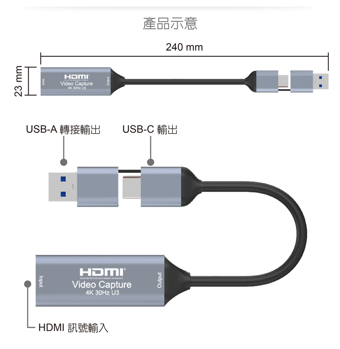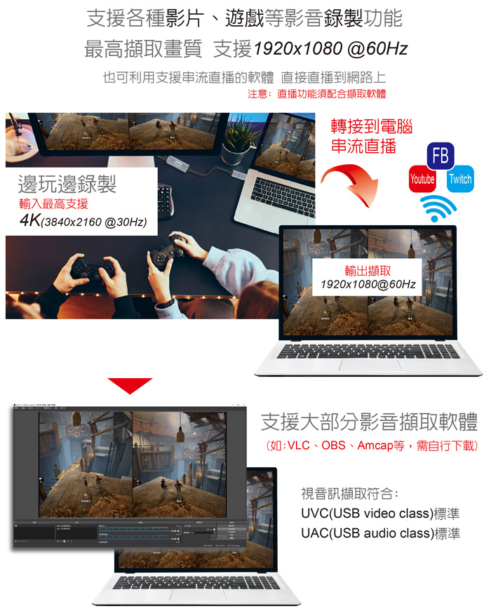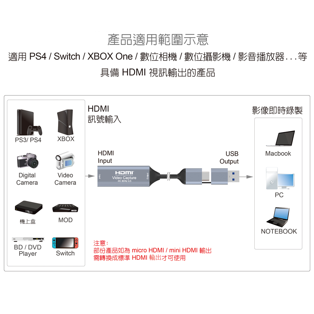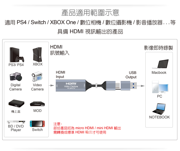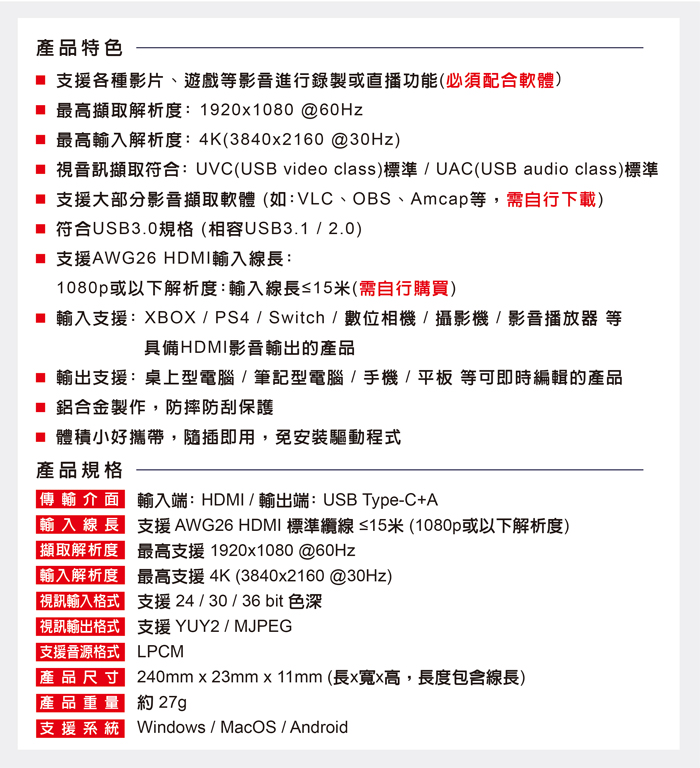 ● 最高擷取支援:1920x1080@60Hz/最高輸入解析度3840x2160@30Hz