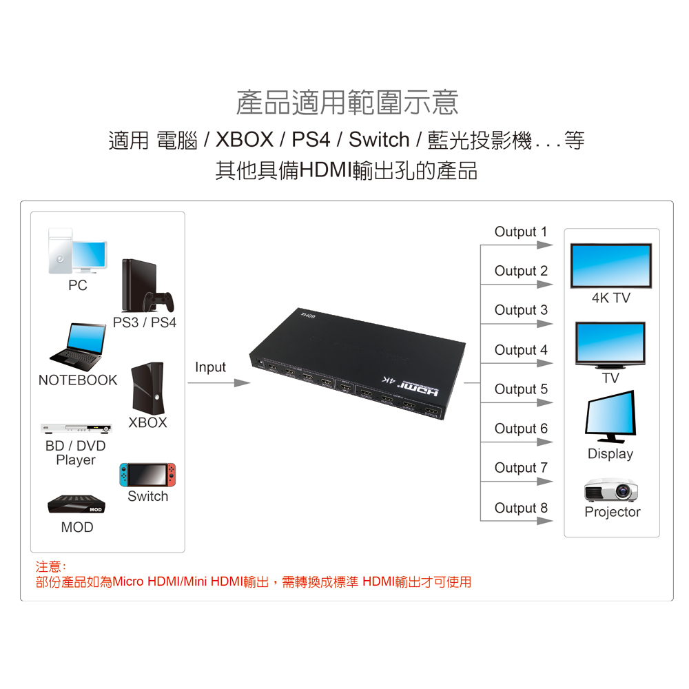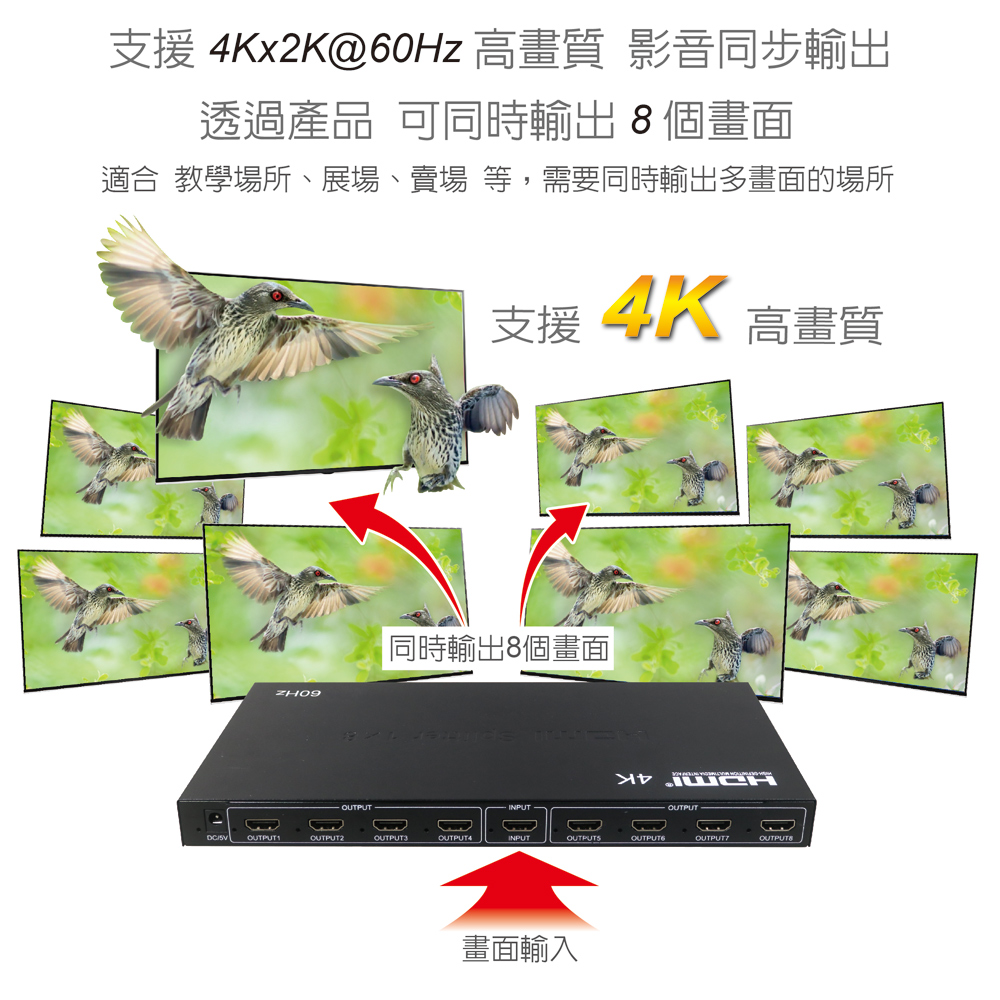 ● 可將1個HDMI信號,同步輸出8個HDMI信號