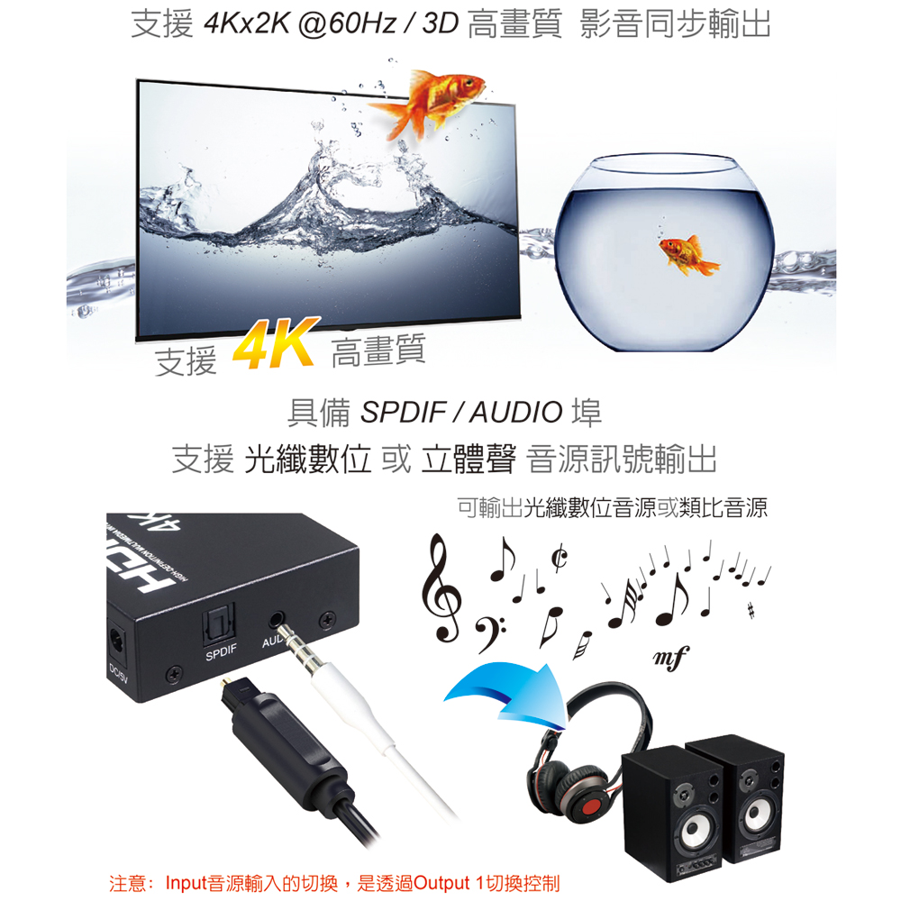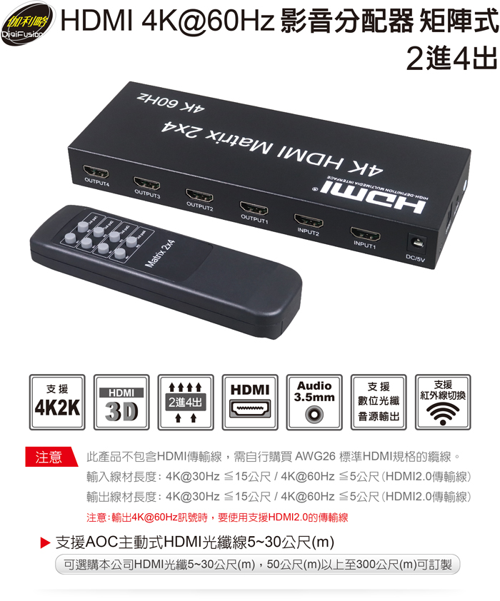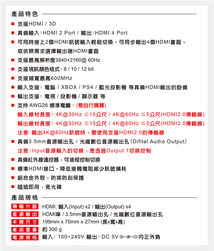 ● 支援4K@60Hz輸入線材≦5公尺;輸出線材≦5公尺