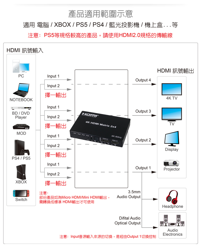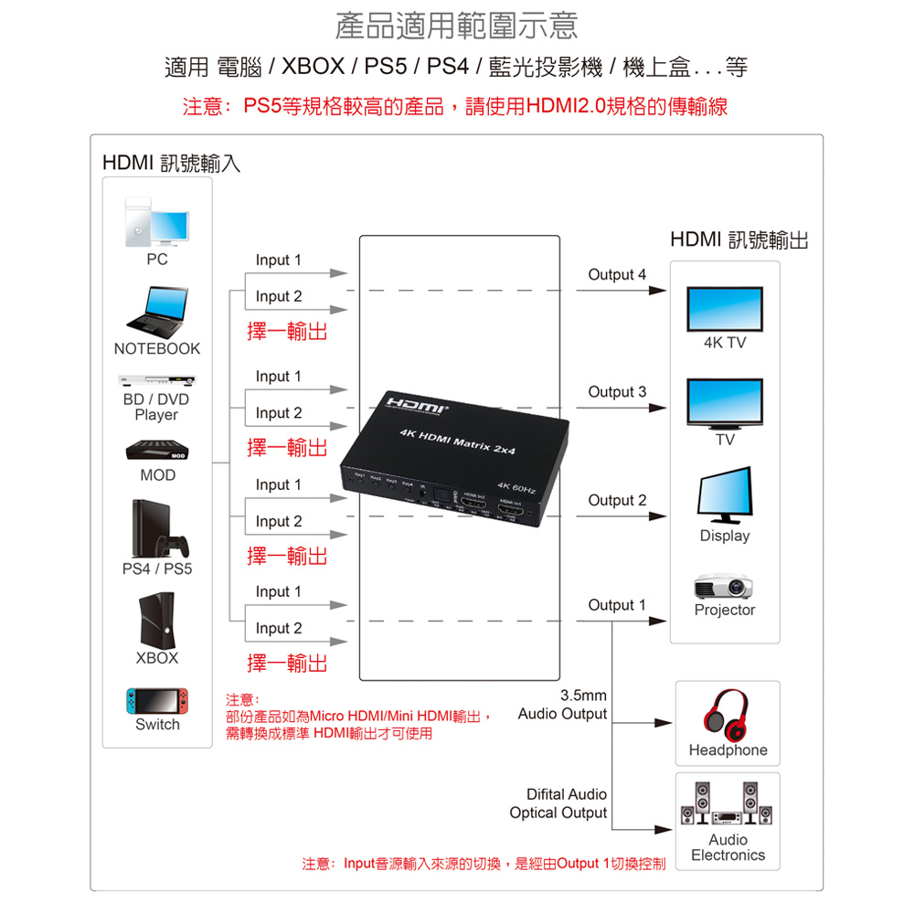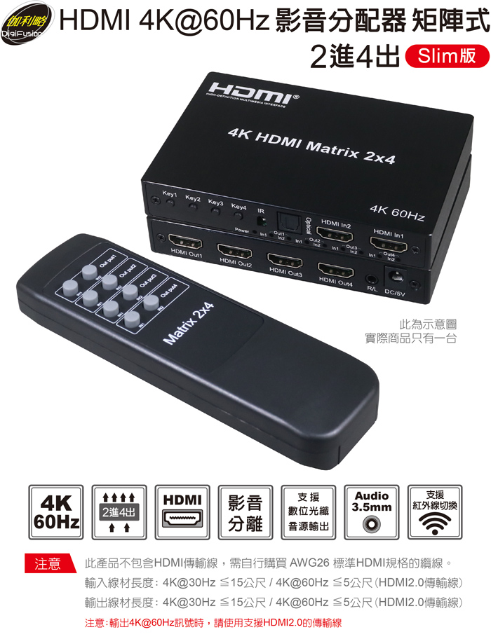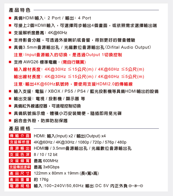 ● 支援4K@60Hz輸入線材≦5公尺;輸出線材≦5公尺