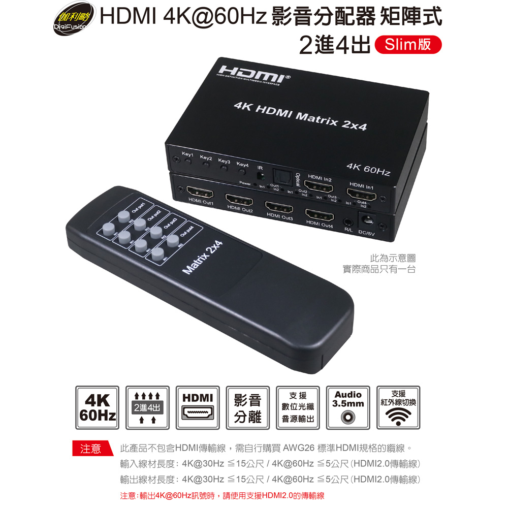 伽利略 HDMI 4K@60Hz 影音分配器 矩陣式 2進4出 Slim版