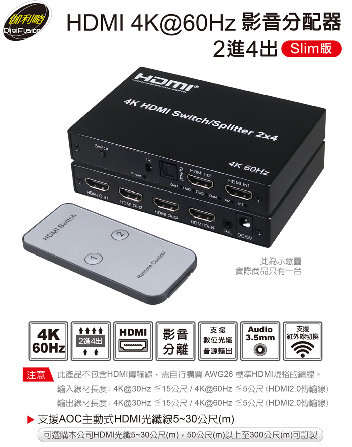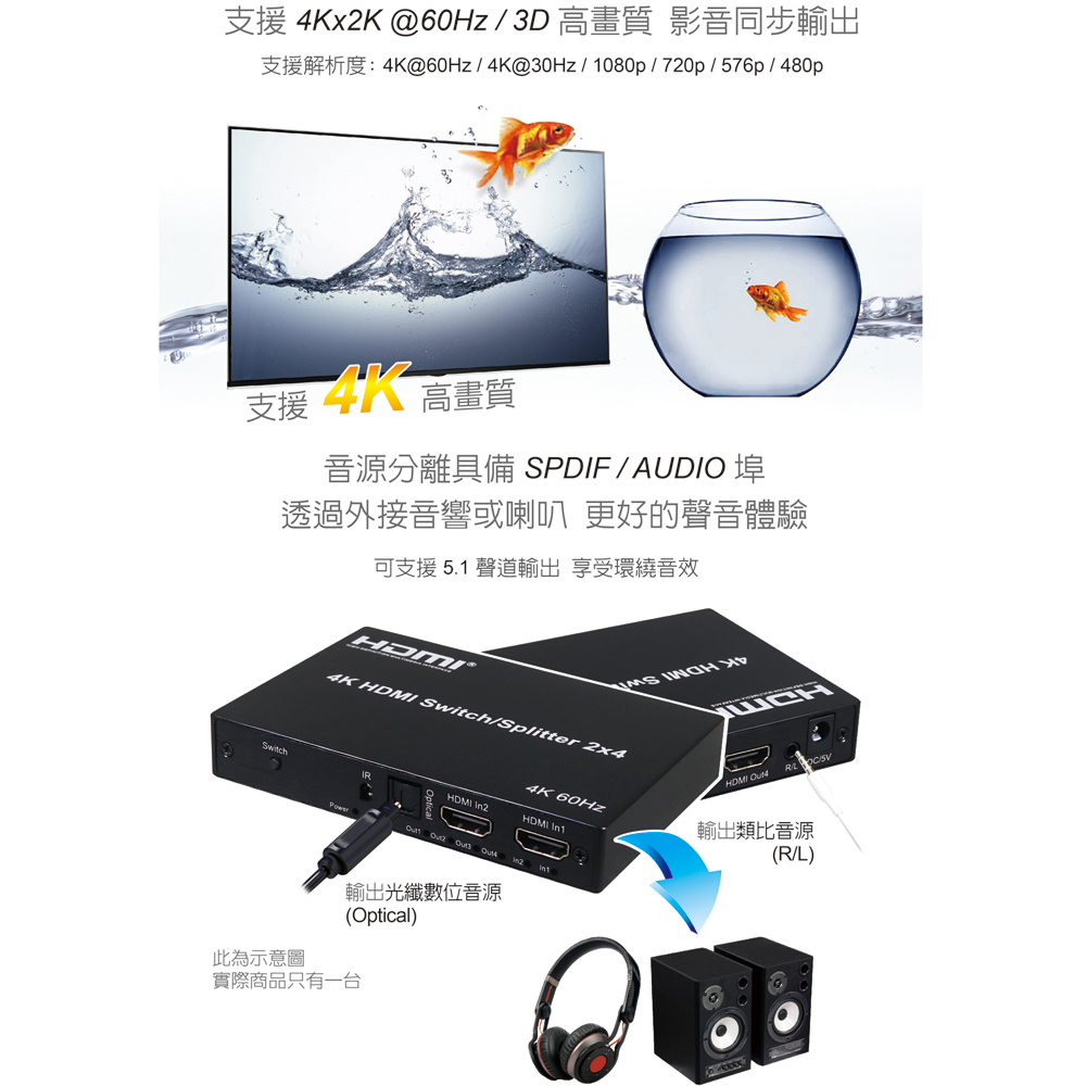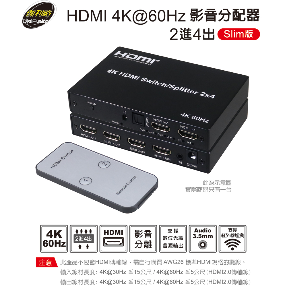 伽利略 HDMI 4K@60Hz 影音分配器 2進4出 Slim版