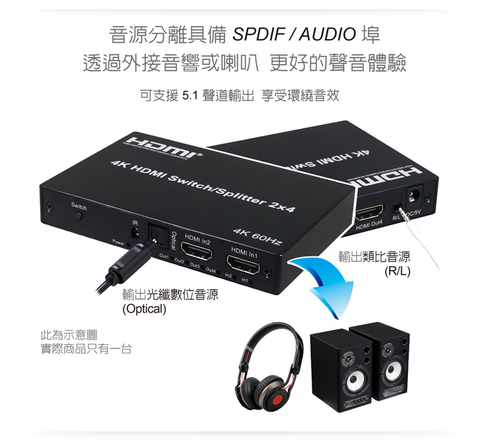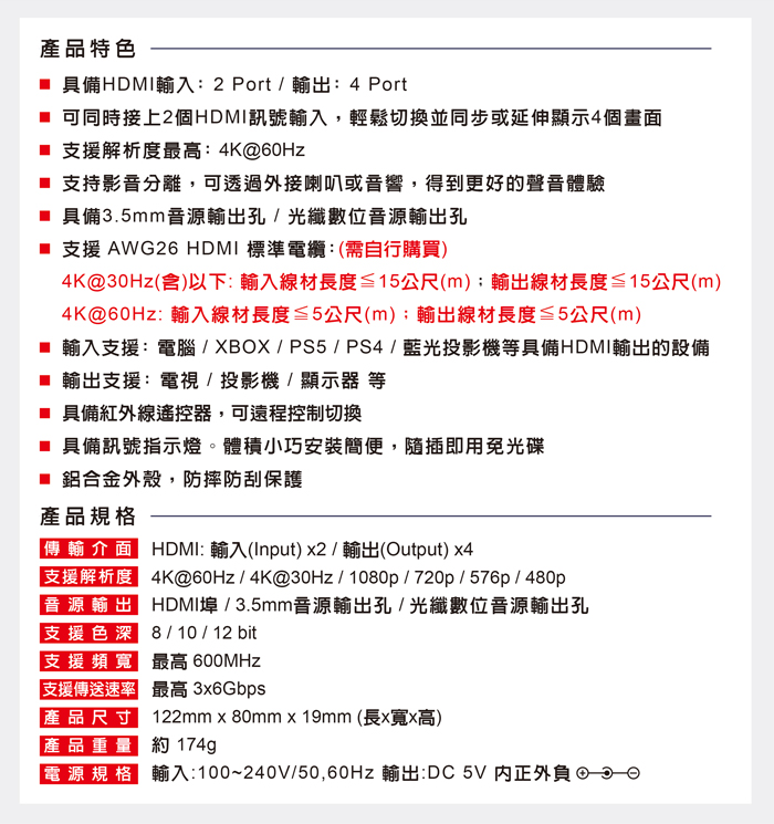 ● 支援4K@60Hz輸入線材≦5公尺;輸出線材≦5公尺