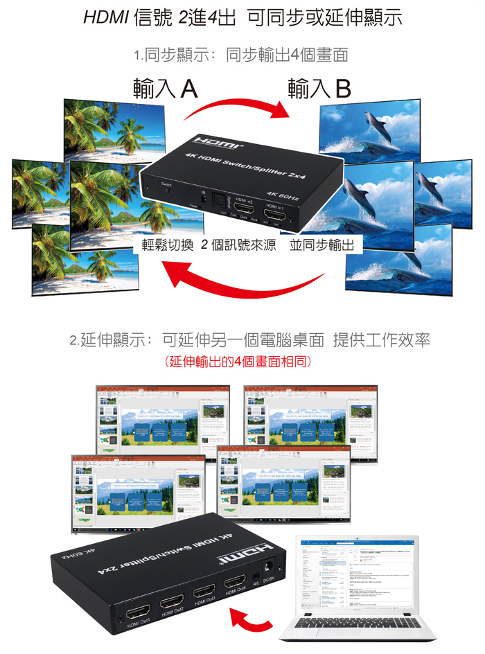 ● 可接上2個HDMI,輕鬆切換同步或延伸顯示4個畫面