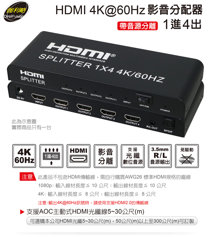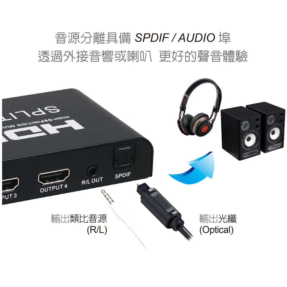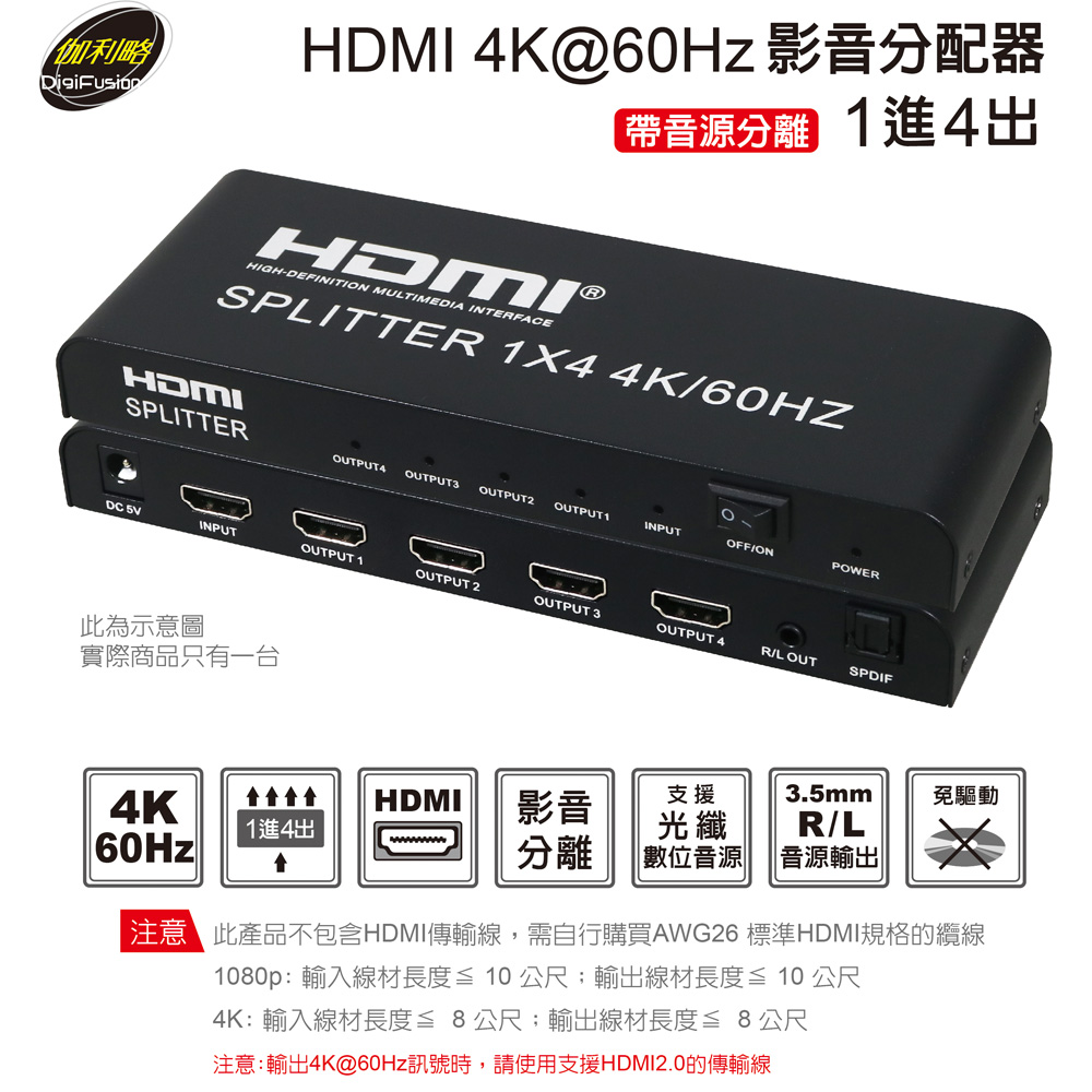伽利略 HDMI 4K@60Hz 影音分配器 1進4出 (帶音源分離)