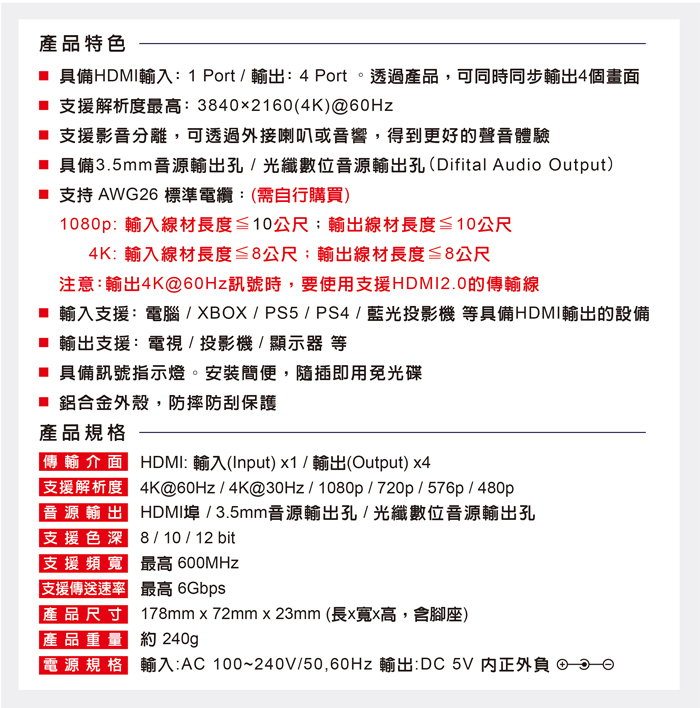 ● 支援4K輸入線材≦8公尺;輸出線材≦8公尺