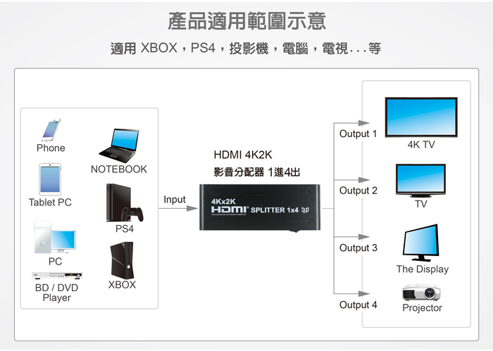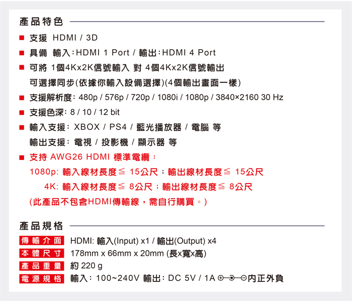 ● 支援4K輸入線材≦8公尺;輸出線材≦8公尺