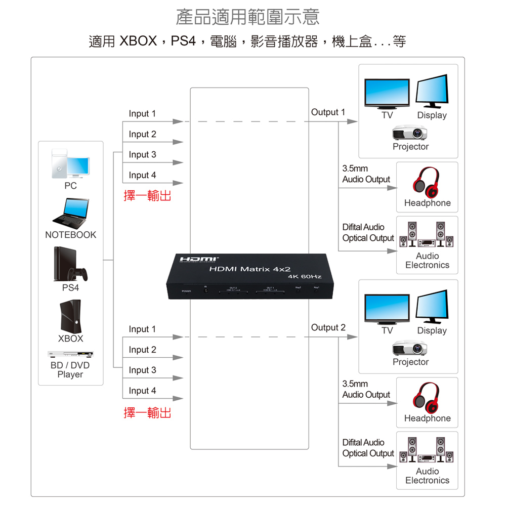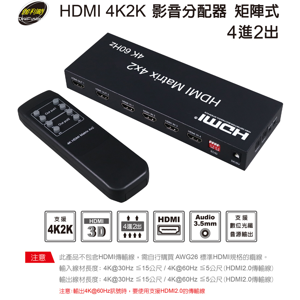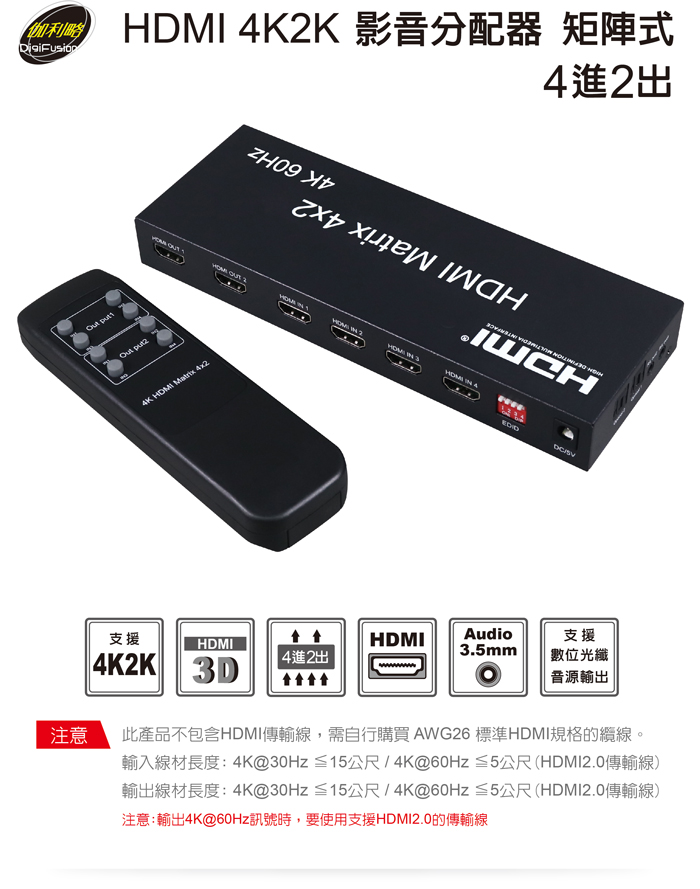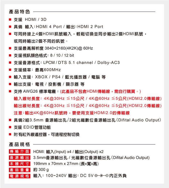 ● 支援4K輸入線材≦5公尺;輸出線材≦5公尺