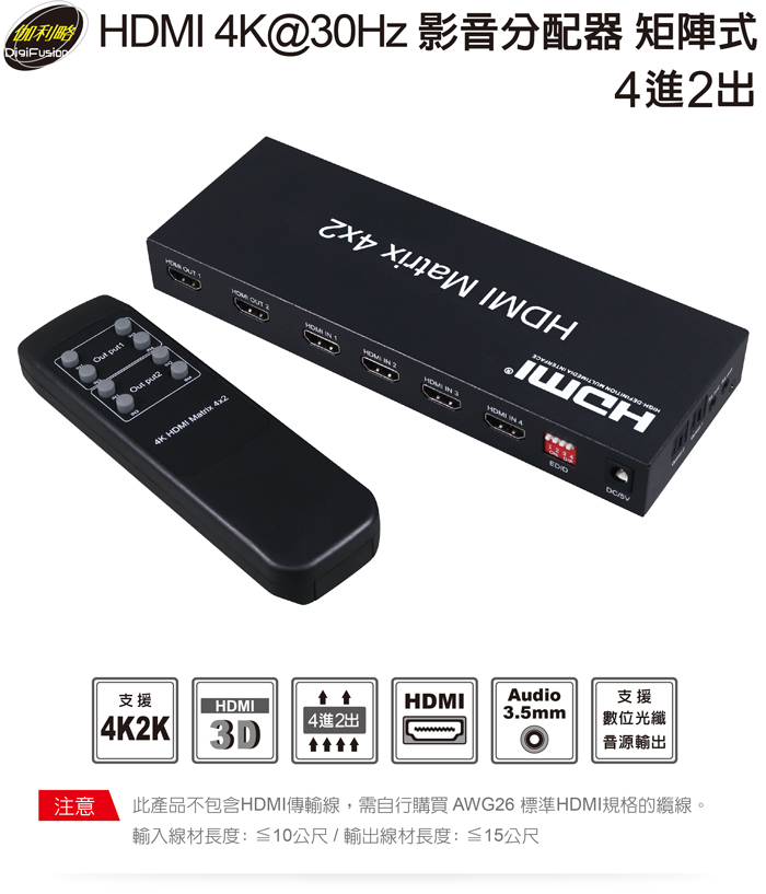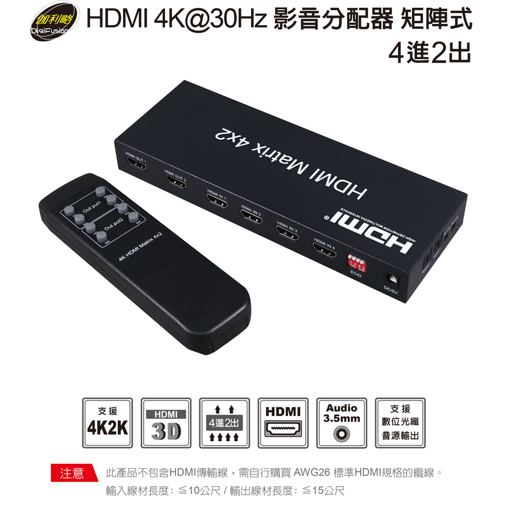 伽利略 HDMI 4K@30Hz 影音分配器 矩陣式 4進2出