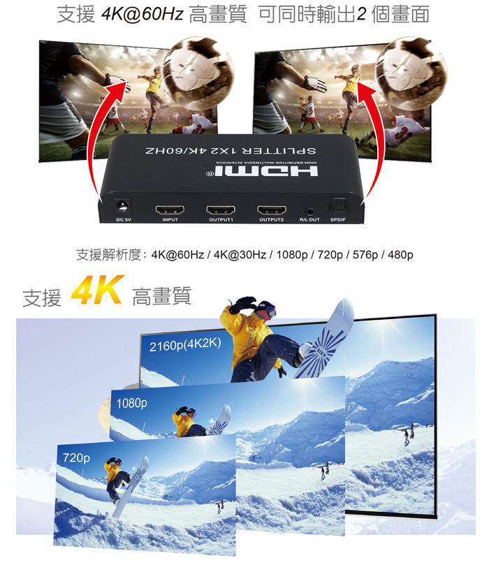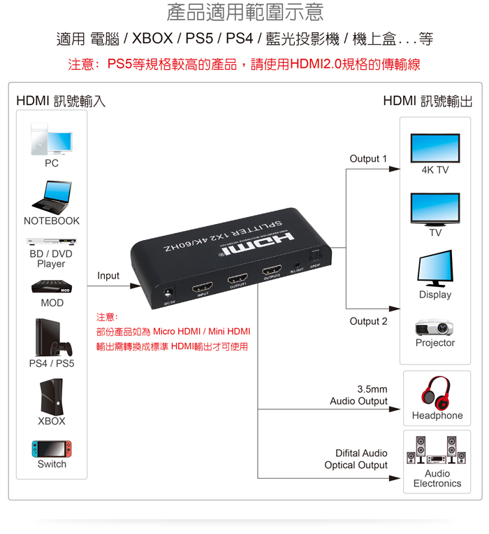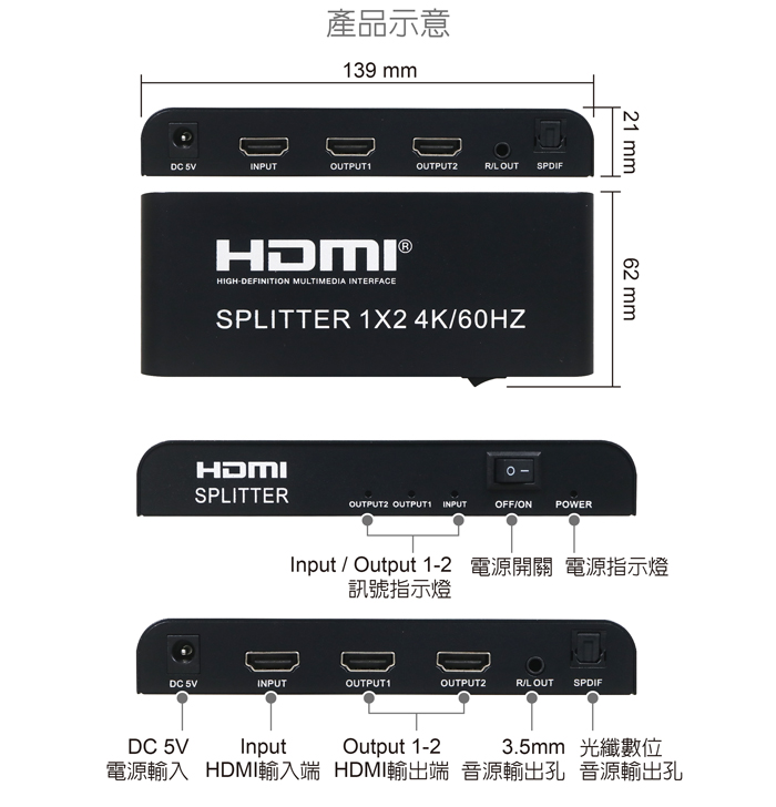 ● 具備HDMI輸入1埠/HDMI輸出2埠