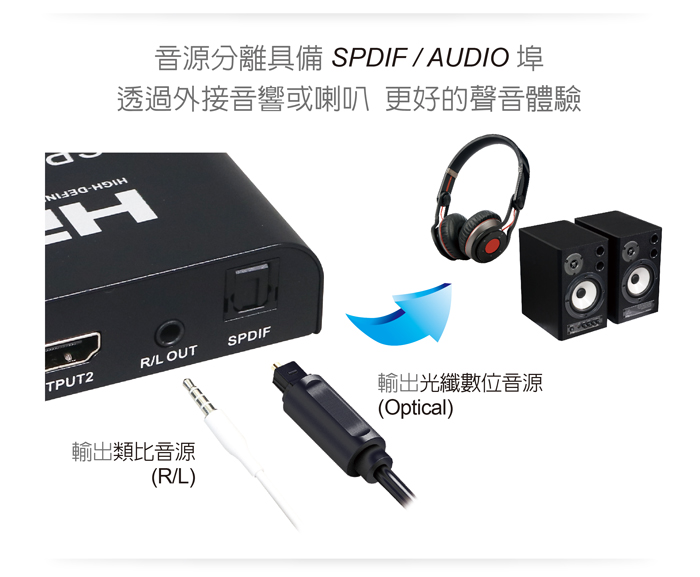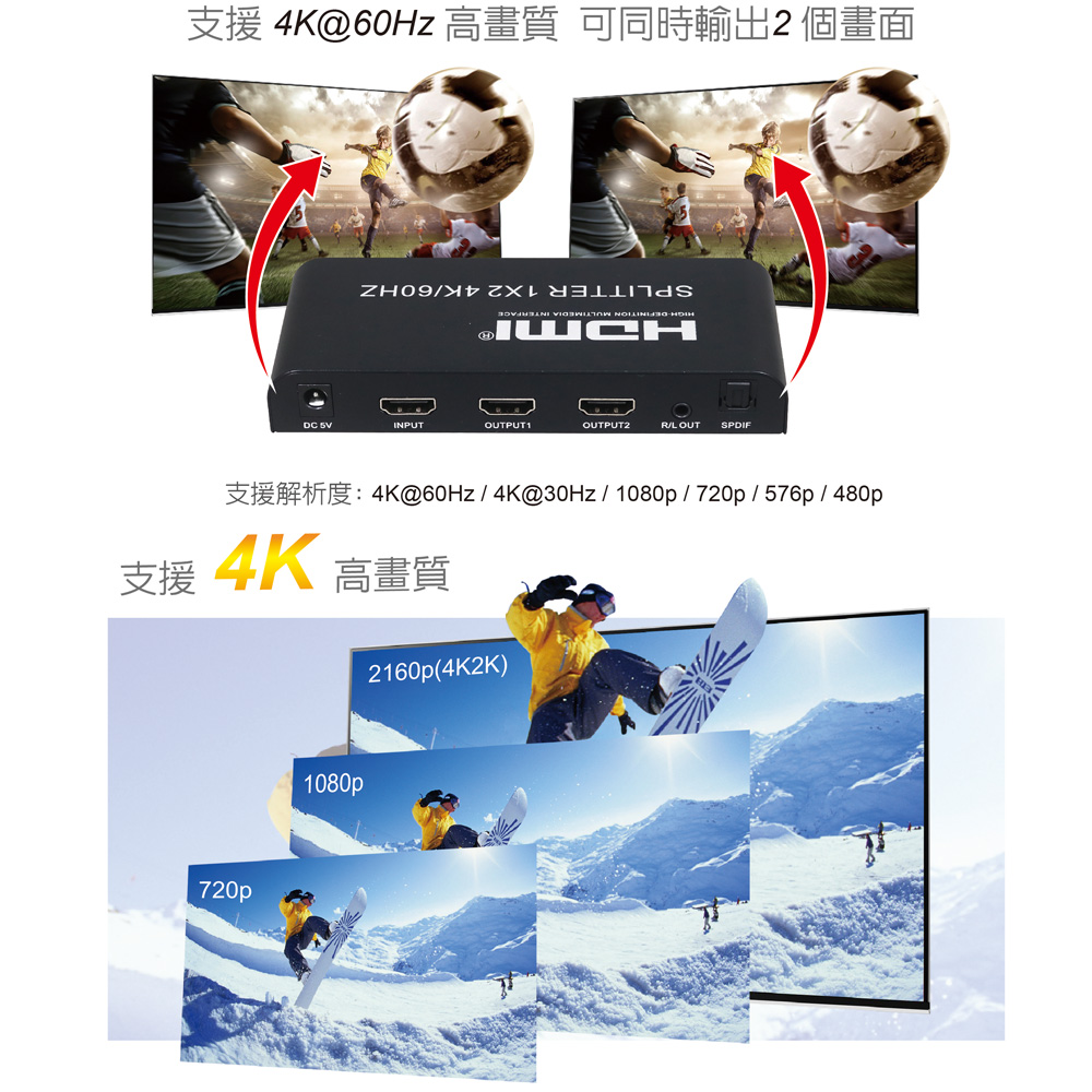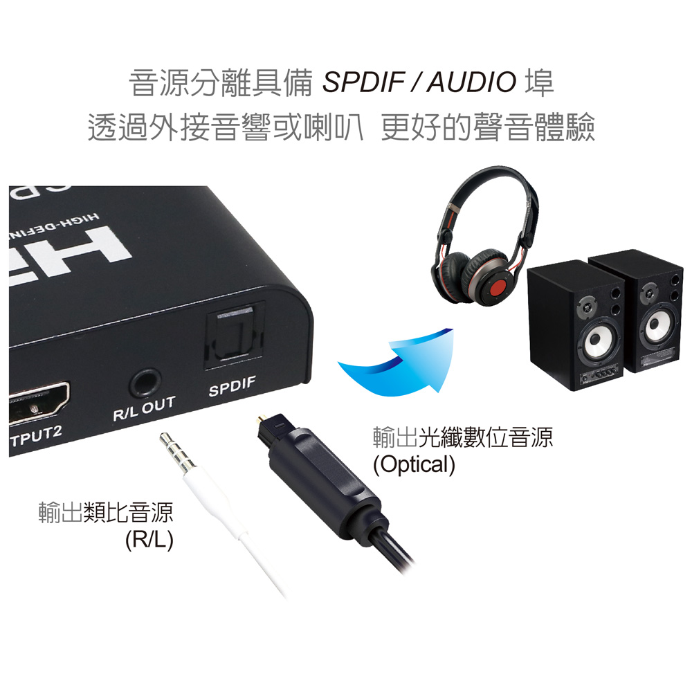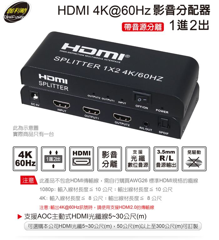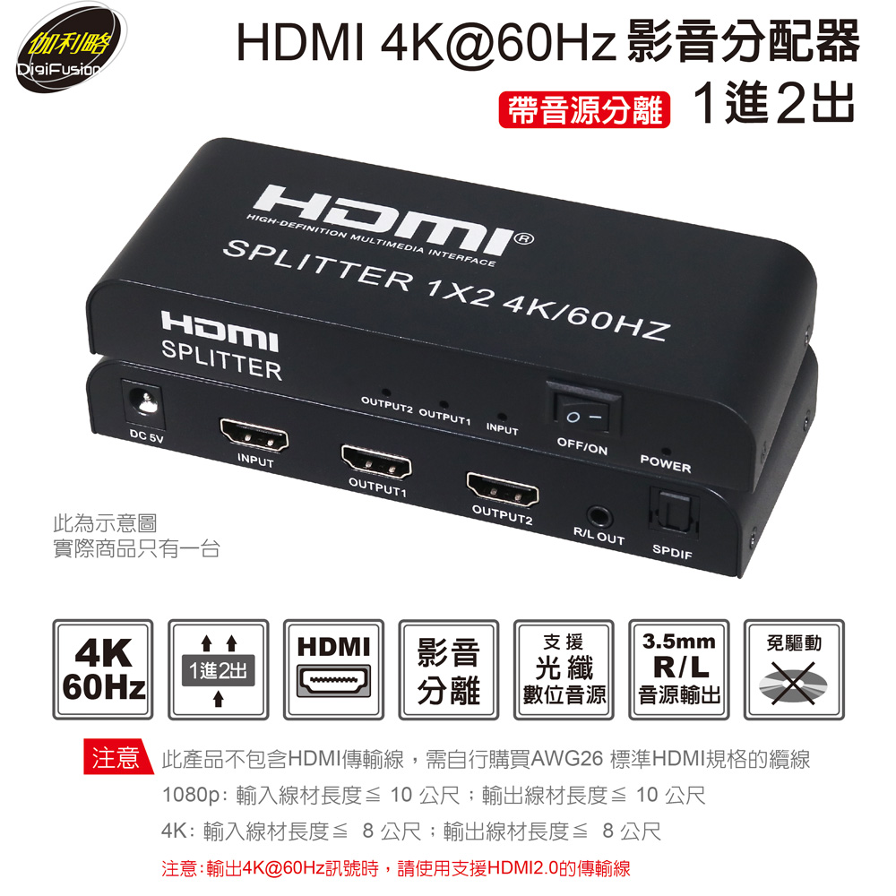 伽利略 HDMI 4K@60Hz 影音分配器 1進2出 (帶音源分離)