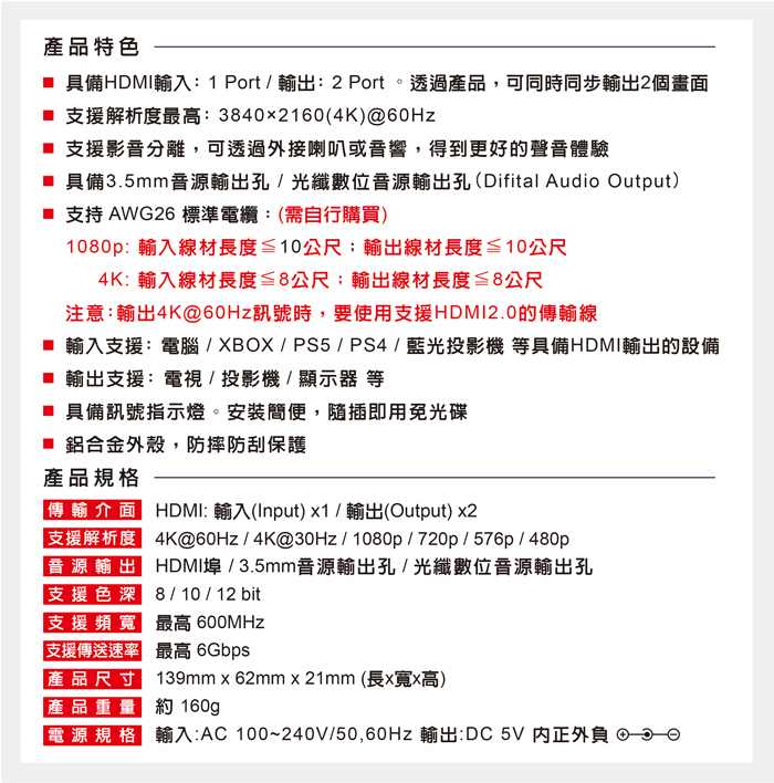 ● 支援4K輸入線材≦8公尺;輸出線材≦8公尺