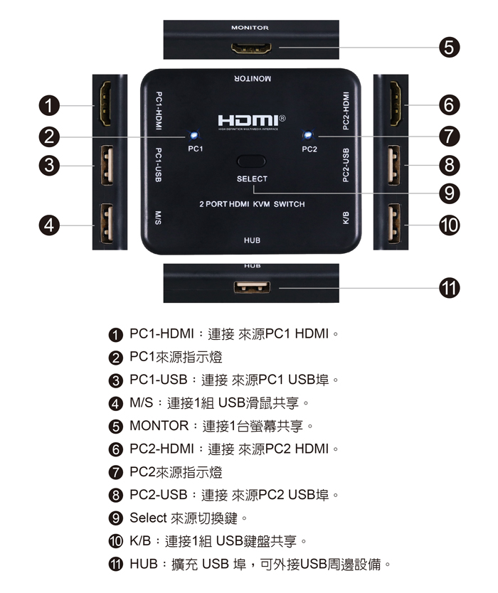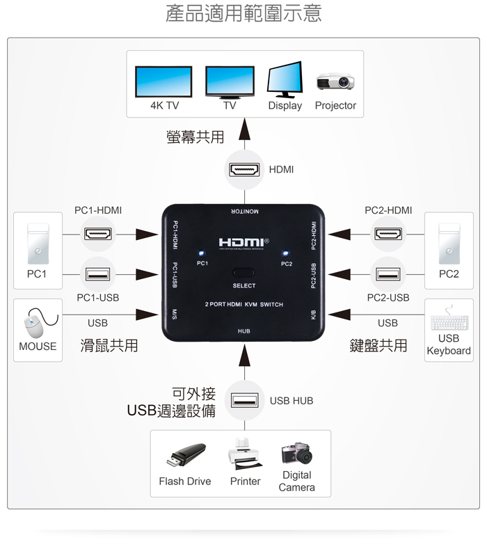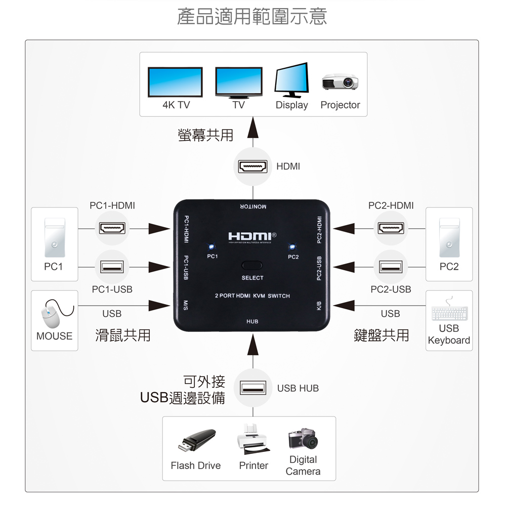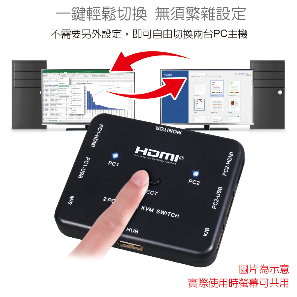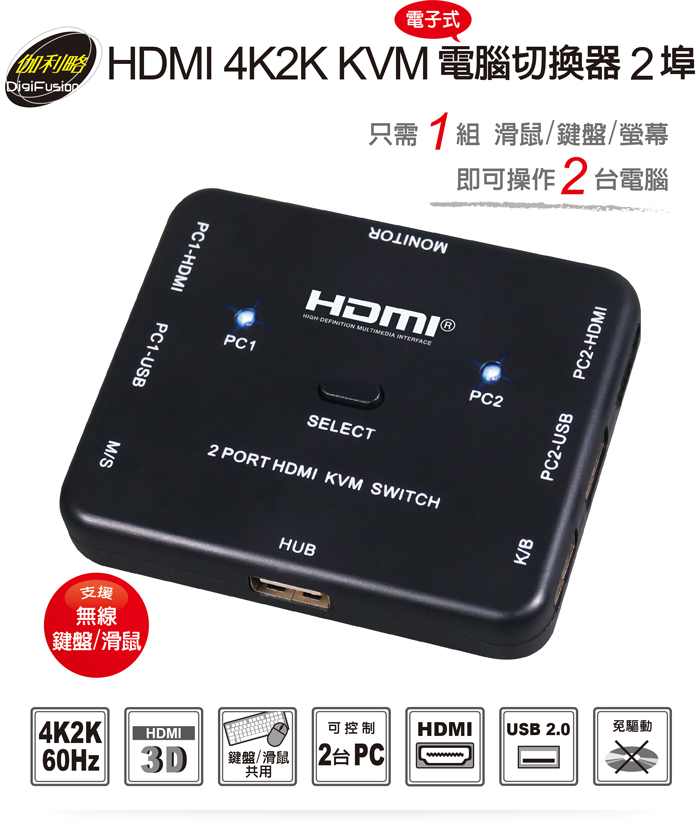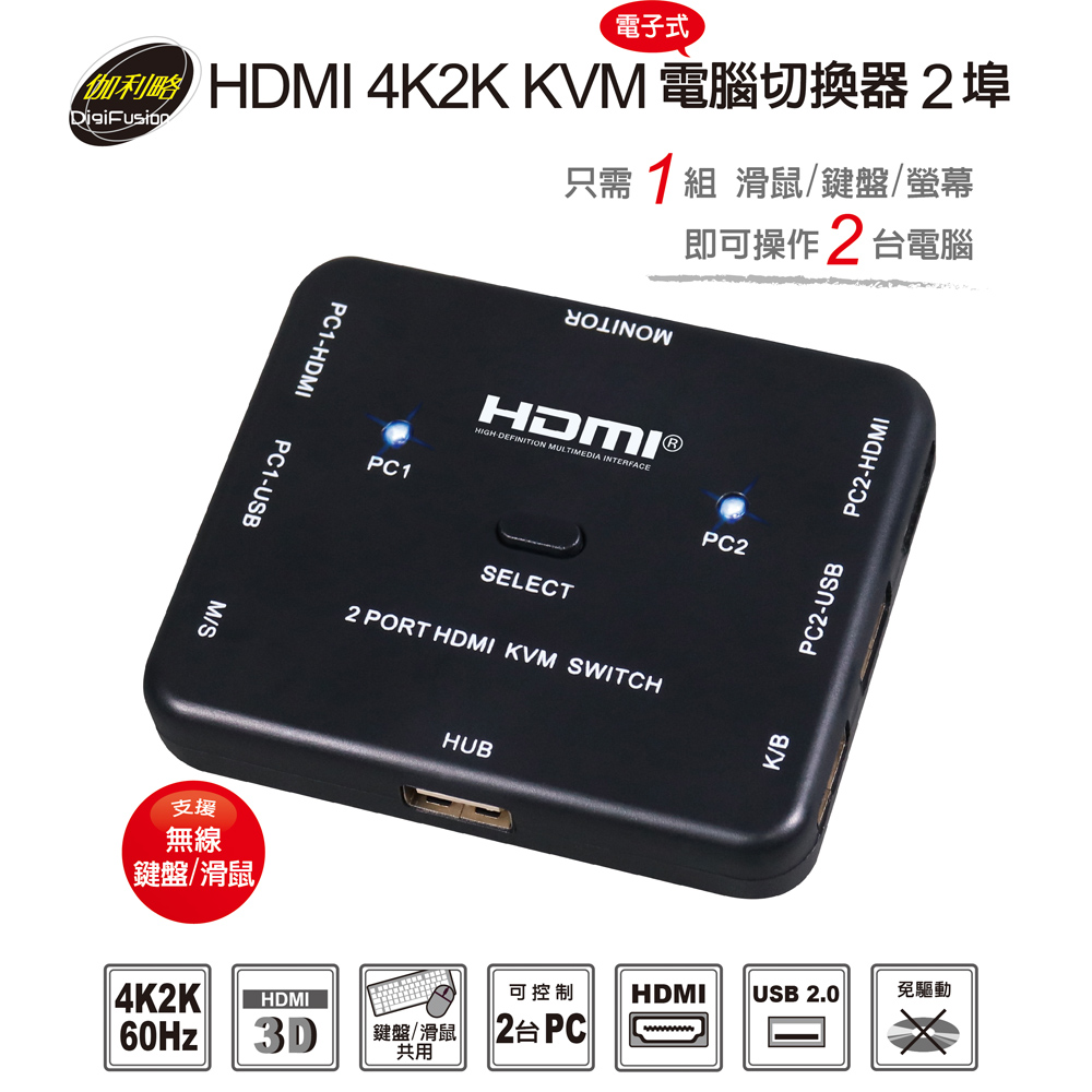伽利略 HDMI 4K2K KVM 電腦切換器 2埠 電子式