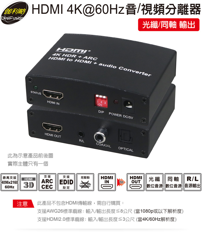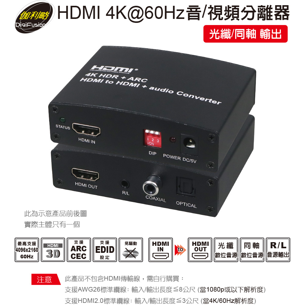 伽利略 HDMI 4K@60Hz 音/視頻分離器 光纖/同軸輸出