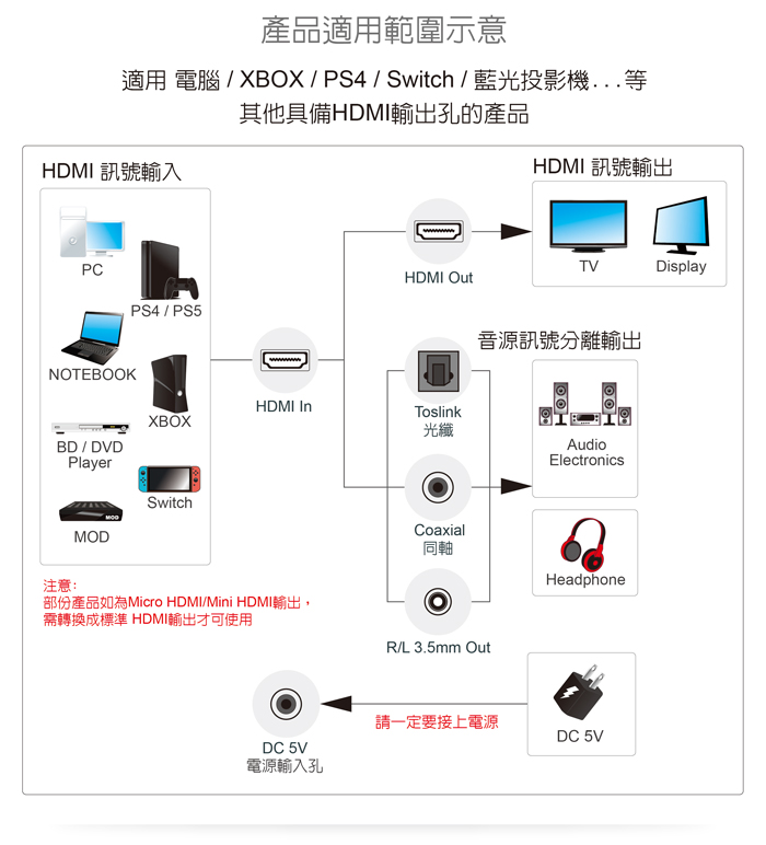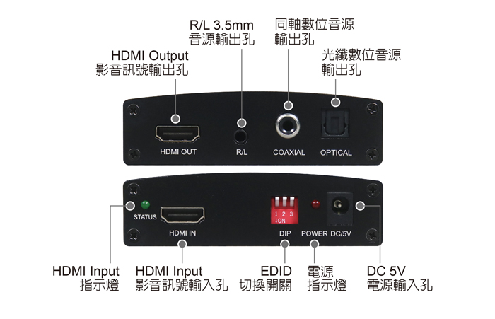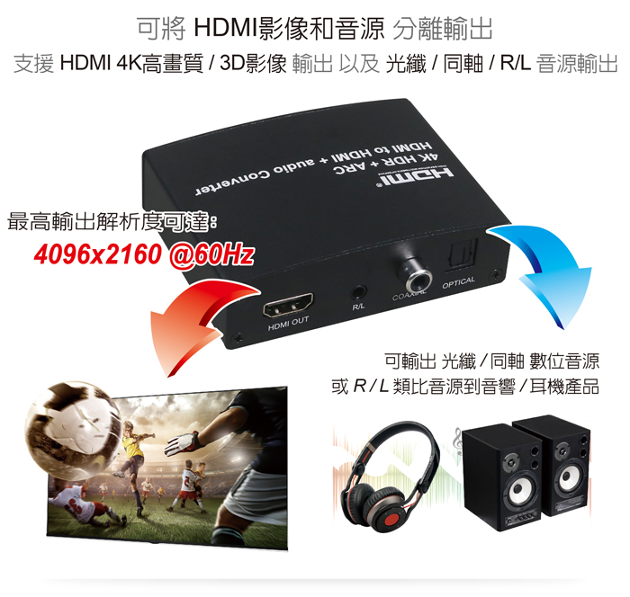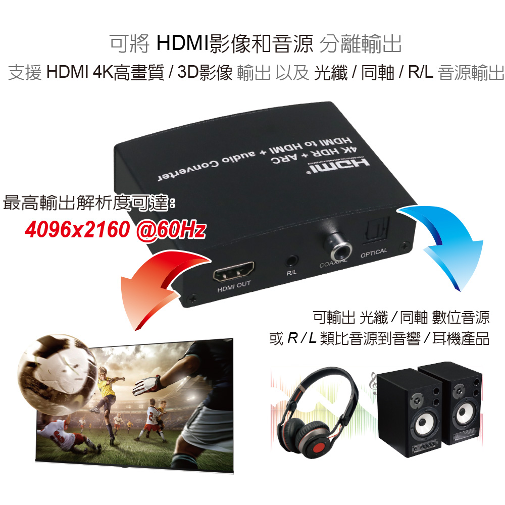 ● 具備HDMI音源輸出功能,可將HDMI視訊和音源訊號分別單獨輸出