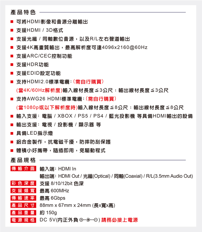● 支援ARC/CEC控制功能 / HDR功能 / EDID設定功能