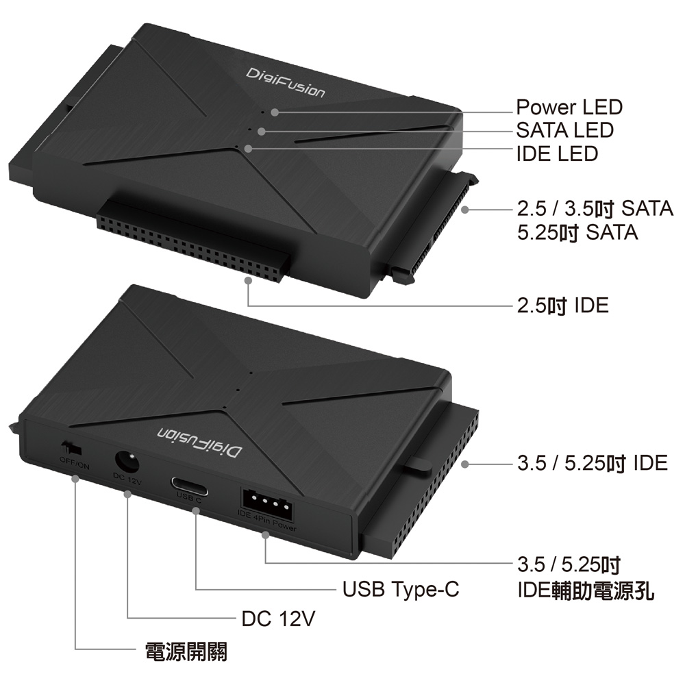 ● 支援多種串接組合,可連接 2.5/3.5/5.25吋 IDE/SATA規格硬碟/光碟機