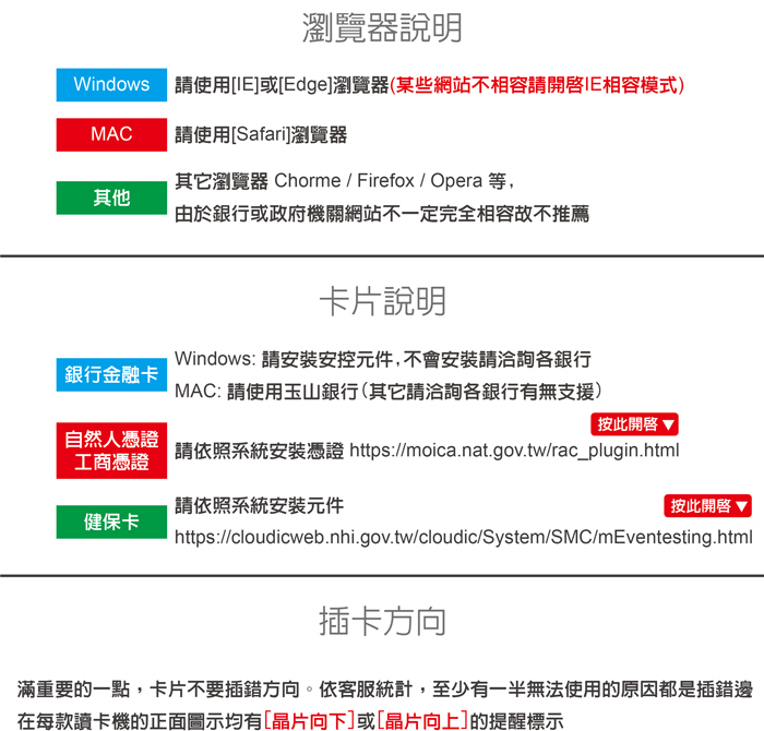 ■ 工商憑證卡:支援公司戶稅務申報,線上電子發票系統,健保加退保等
