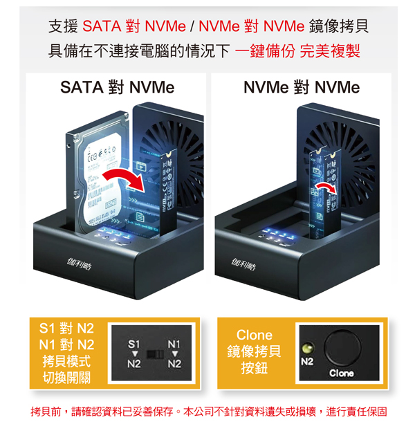 - 支援 SATA 對 NVMe M.2 或 NVMe M.2 對 NVMe M.2 鏡像拷貝
