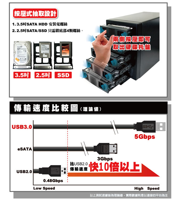 ■ 每一槽支援3種規格硬碟:3.5吋 / 2.5吋 / SSD