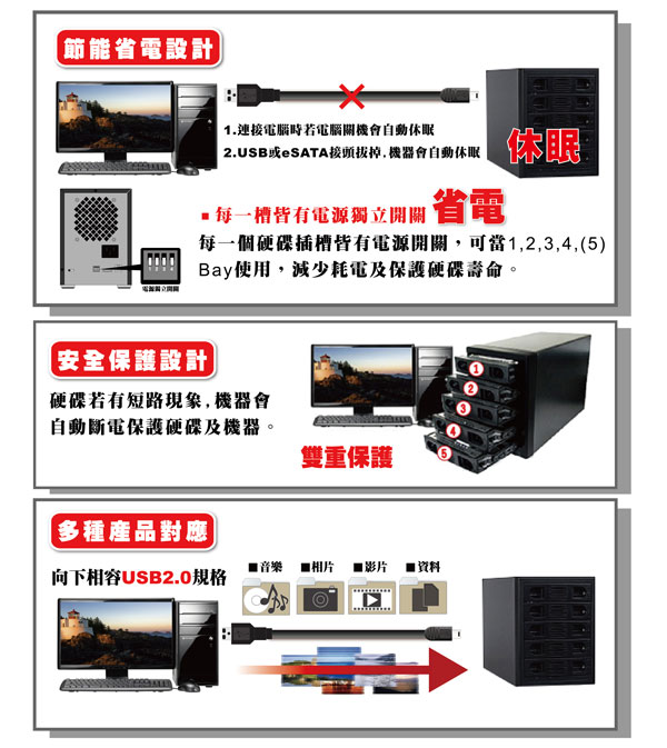 ■ 使用eSATA介面時,電腦或擴充卡的eSATA插槽需支援Port Multiplier(端口倍增器)