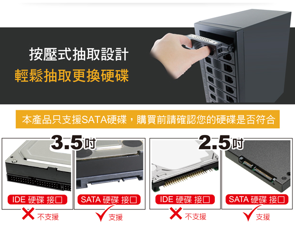支援SATA 2.5吋硬碟/SSD & 3.5吋硬碟,3.5吋硬碟單槽最大支援到22TB以上!