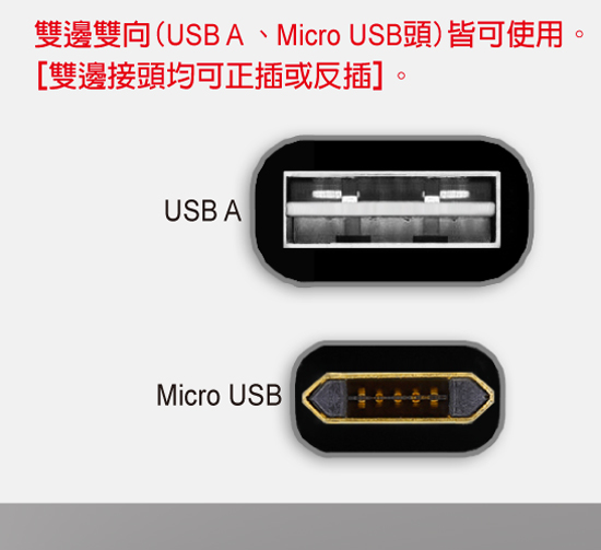 不怕插錯方向,雙邊雙向 (USB A、Micro USB 頭) 皆可使用