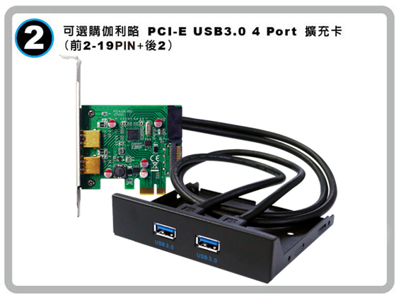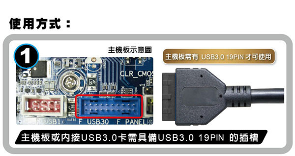需搭配主機板內建 USB3.0 19pin 插座或 PCI-E 19pin USB3.0 擴充卡一起使用