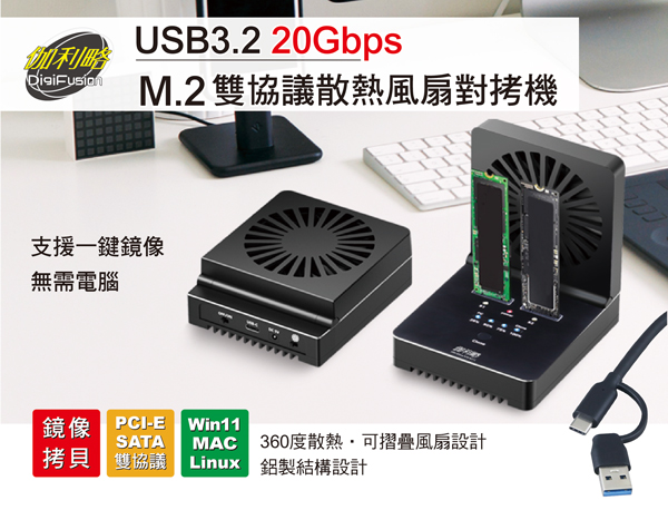 - 支援雙協議PCI-E(NVMe) M.2 SSD / SATA(NGFF) M.2 SSD;可同時讀取2支M.2 SSD,方便存取資料。