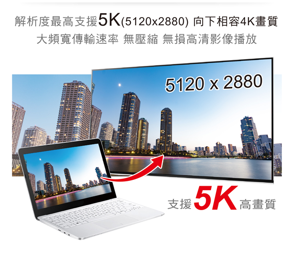 解析度最高支援5K (5120x2880),向下相容4K畫質。大頻寬傳輸速率,無壓縮,無損高清影像播放