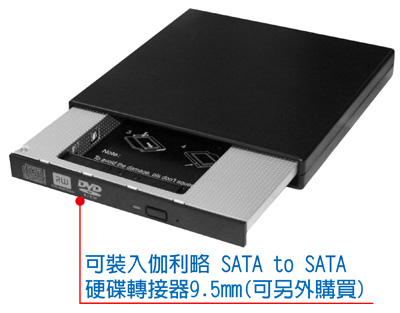 SATA to SATA硬碟轉接器9.5mm,正面裝入DVD ROM外接套件(9.5mm)示意圖