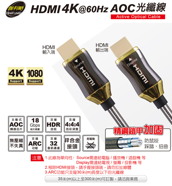 伽利略 HDMI 4K@60Hz AOC光纖線 (5~100米)