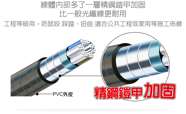 線體內部多了一層精鋼鎧甲加固,比一般光纖線更耐用