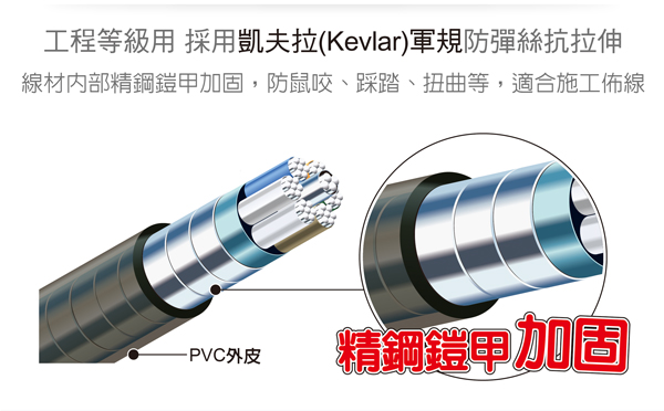 工程等級用,採用凱夫拉(Kevlar)軍規防彈絲抗拉伸。線材內部精鋼鎧甲加固,防鼠咬、踩踏、扭曲等,適合施工佈線