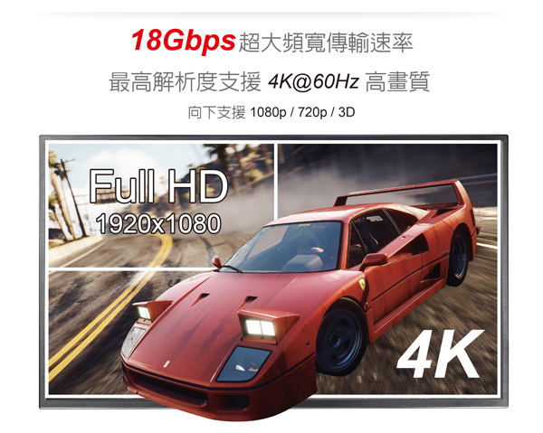 解析度最高可支援4K@60Hz,高清影音傳輸無壓縮 (支援1080p / 720p / 3D)
