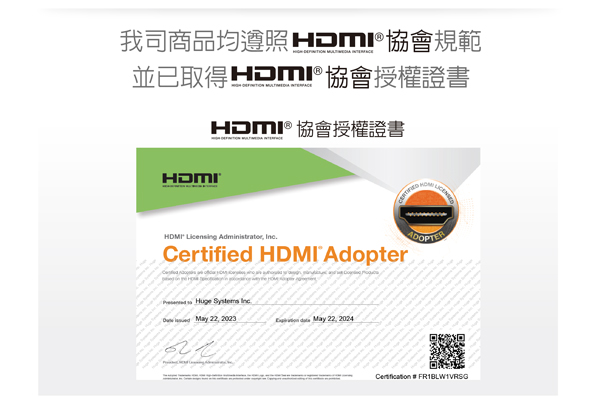 專業級線材均遵照HDMI協會規範,並取得HDMI協會授權證書