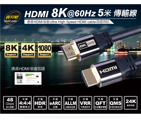 產品名稱: 伽利略 HDMI 8K@60Hz 5米 傳輸線 產品型號: CABLE805