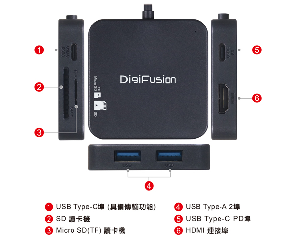 - 4in1多功能轉接器,可擴充HDMI / USB3.2 Gen1 3埠(2A+1C) / 讀卡機 / PD埠