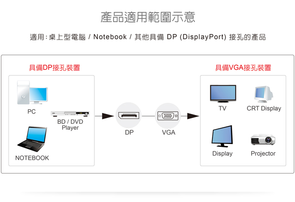 可將具備DisplayPort(DP)接孔的設備訊號,轉換成VGA訊號輸出