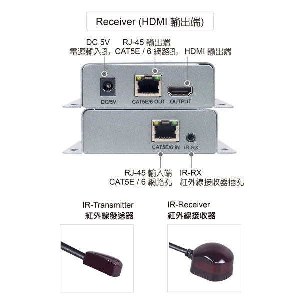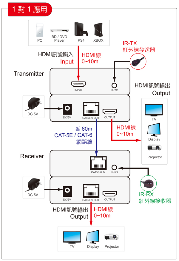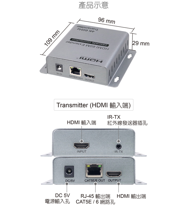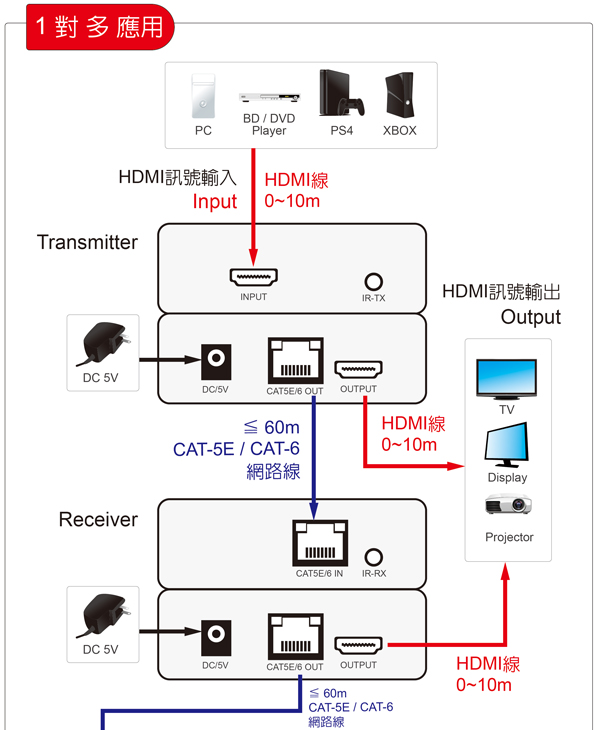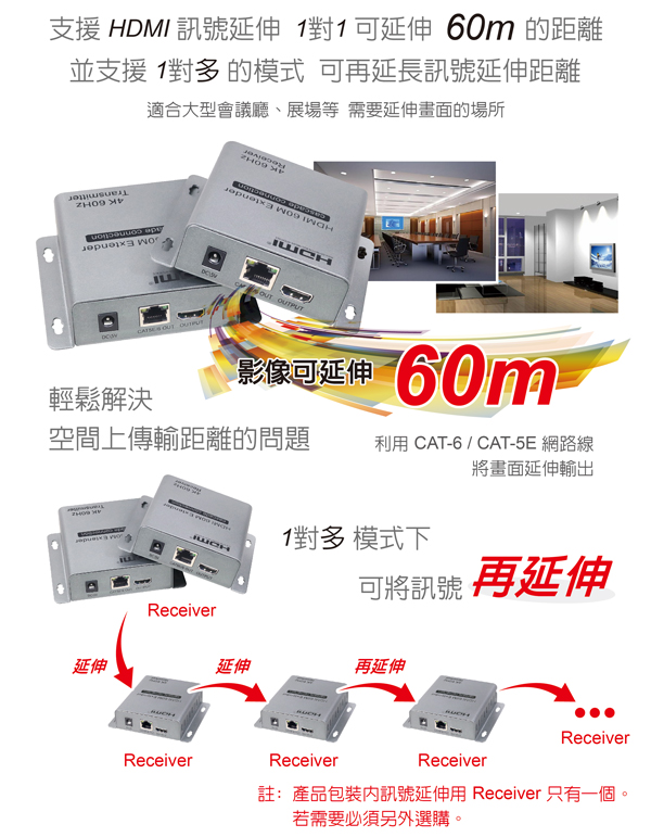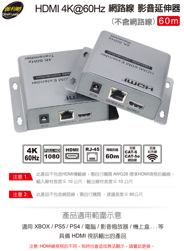 支援 CAT-5E/6 規格以上網路線: 線材長度 ≦60公尺