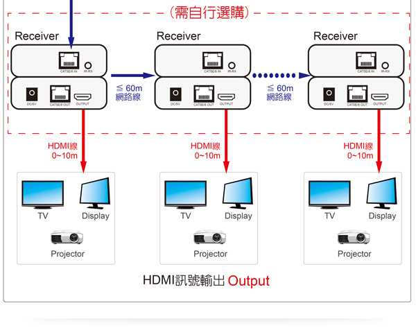 - 利用網路線,可將訊號延長到60公尺: (需自行購買)