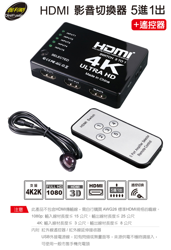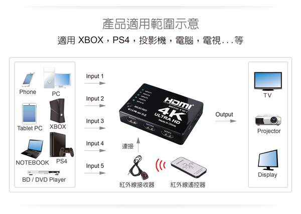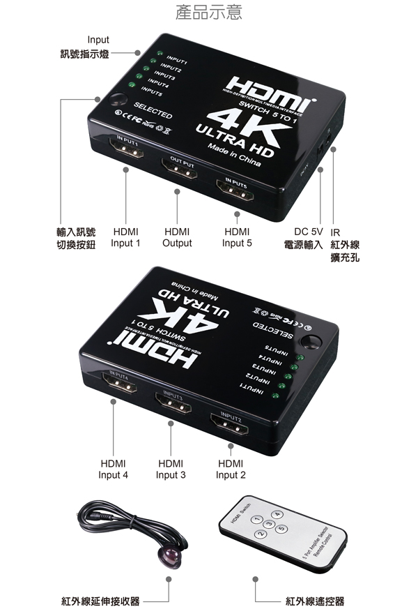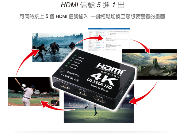 - 具備 輸入: HDMI 5 Port / 輸出:HDMI 1 Port