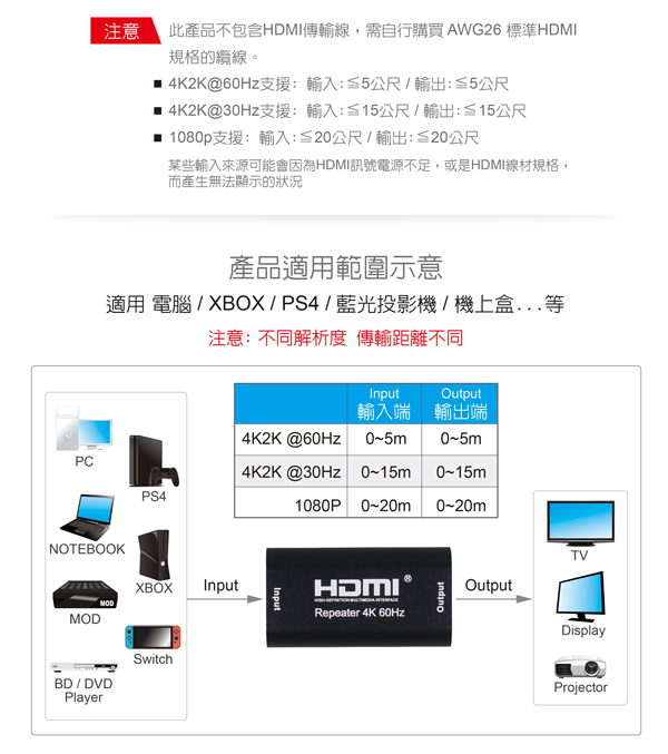 4K2K@60Hz支援: 輸出≦5公尺 / 4K2K@30Hz支援: 輸出≦15公尺