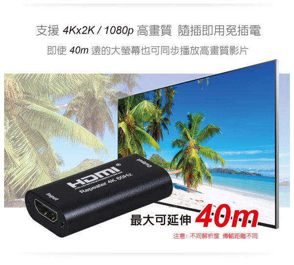 4K2K@60Hz支援: 輸入≦5公尺 / 4K2K@30Hz支援: 輸入≦15公尺