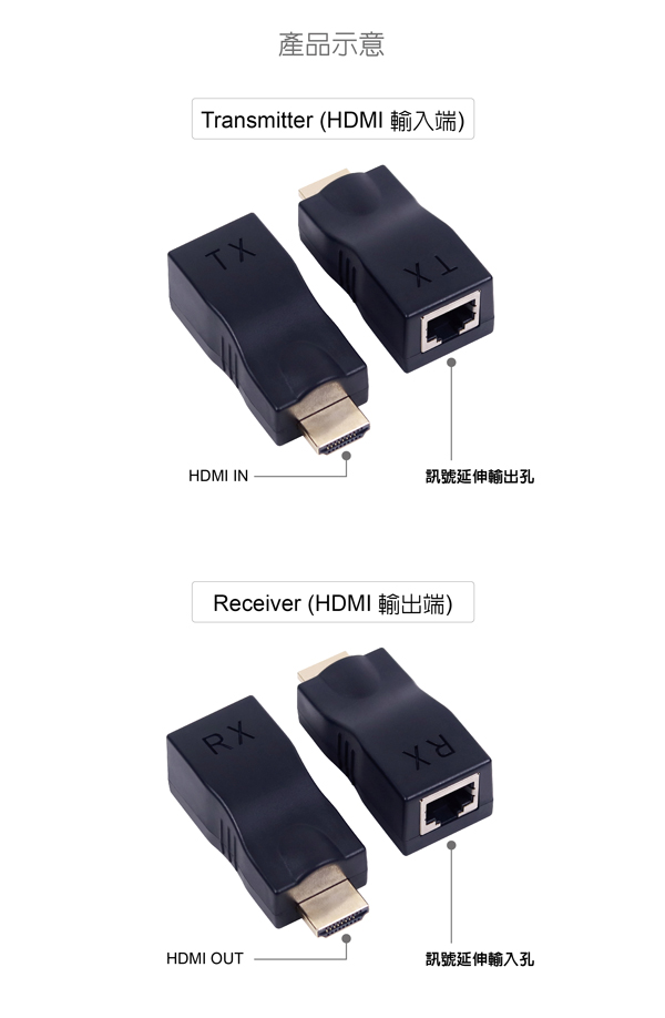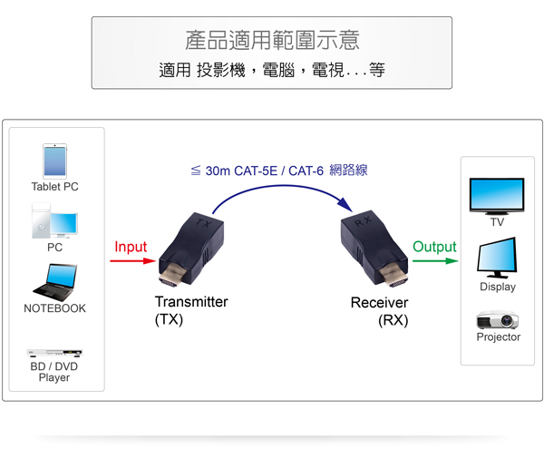 支援 CAT-6 / CAT-5E 規格網路線:線材長度≦30公尺(視輸出訊號決定)
