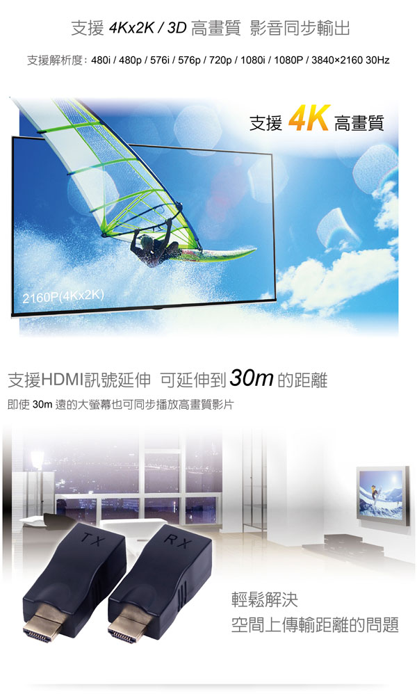支援4K2K@30Hz(必須使用Cat-6網路線規格) / 1080p 訊號輸入