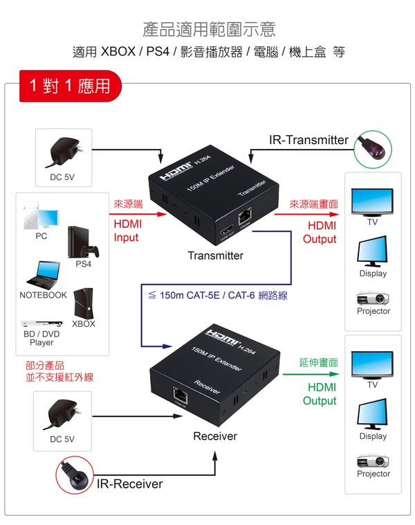 - 利用網路線,可將訊號延長到150公尺 (此產品不包含網路線,需自行購買)