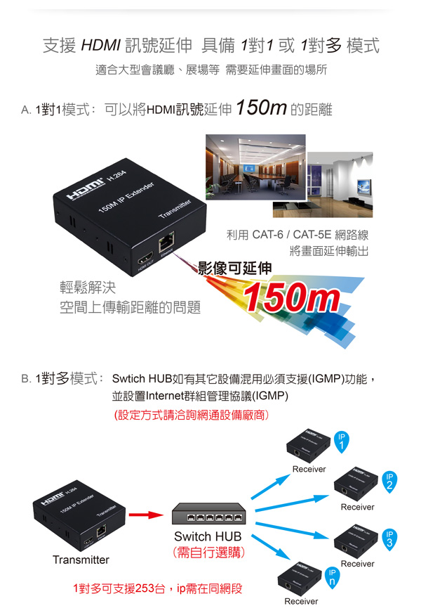 (1對多可支援253台,ip需在同網段。Swtich HUB如有其它設備混用必須支援(IGMP)功能,並設置Internet群組管理協議(IGMP)。設定方式請洽詢網通設備廠商)