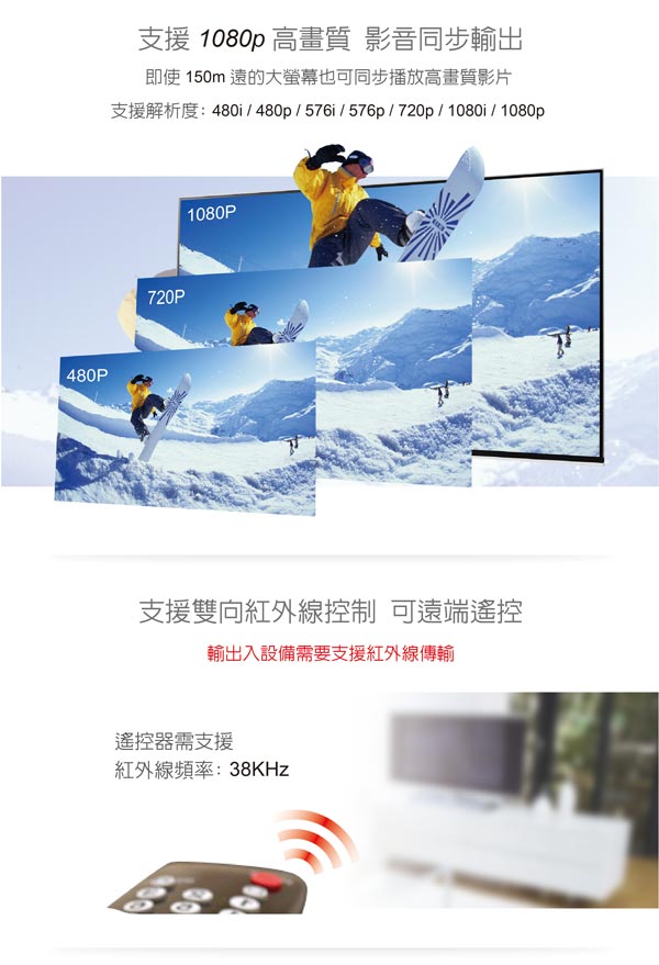 - 支援雙向紅外線控制: IR頻率38 KHz NEC(輸出入設備需要支援紅外線傳輸)