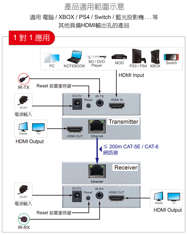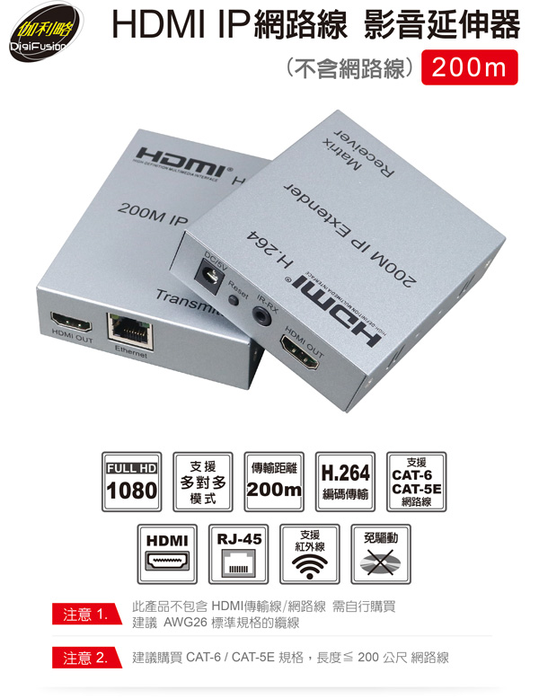 支援 CAT-6 / CAT-5E 規格網路線:線材長度≦ 200公尺